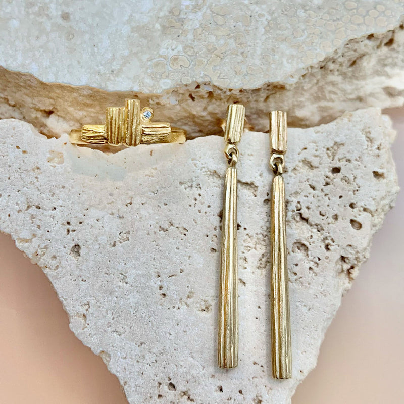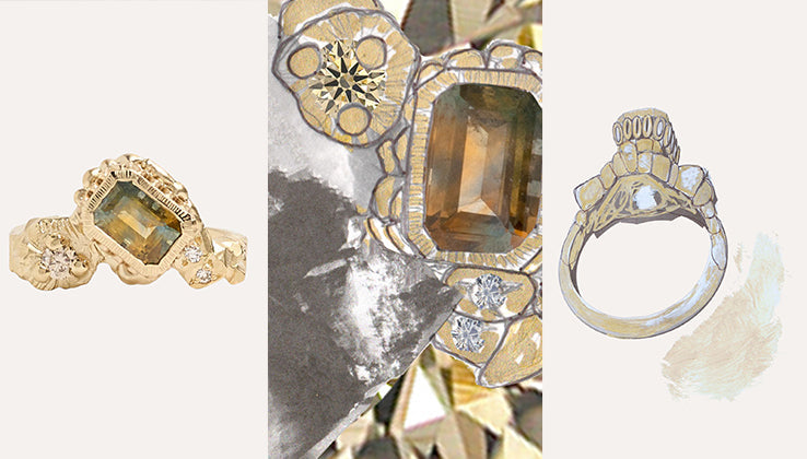 I love the contrast of the clean, precise lines and high polished surface of gemstones against a rough organic faulted surface finish on a metal. The depth and warmth of yellow gold (my preferred material to work in) that has some light and shade thanks to texture, a loose line, an element of layering and the facet and gleam of a beautifully cut stone: divine.