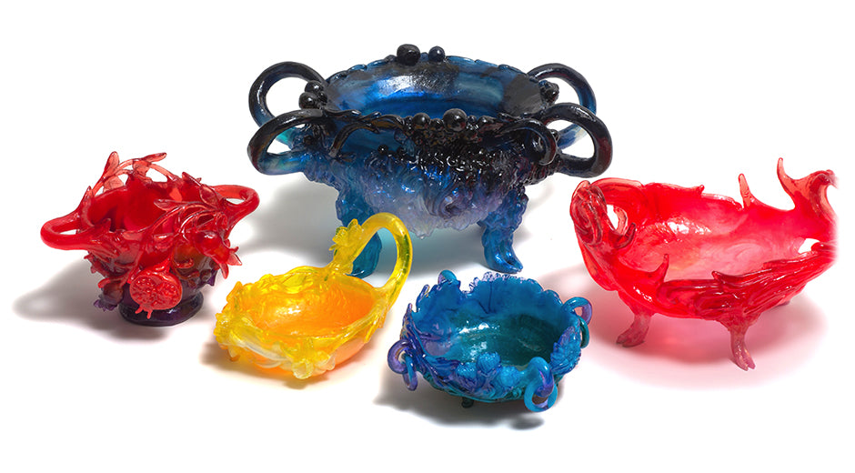 Rohde presents a new series of resin vessels loosely inspired by heirloom vegetables including rainbow chard, kohlrabi and the many varieties of pumpkins and tomatoes. The interest in these fruits and vegetables stems from a realisation of the many spectacular colours and forms these rarer varieties encompass, and that historically have informed many classic silhouettes in the decorative arts such as the double gourd shaped vessels common in Chinese ceramics. Kate's window installation speaks to the beginning of her practice through to the present day and her mastery of resin as a material.
