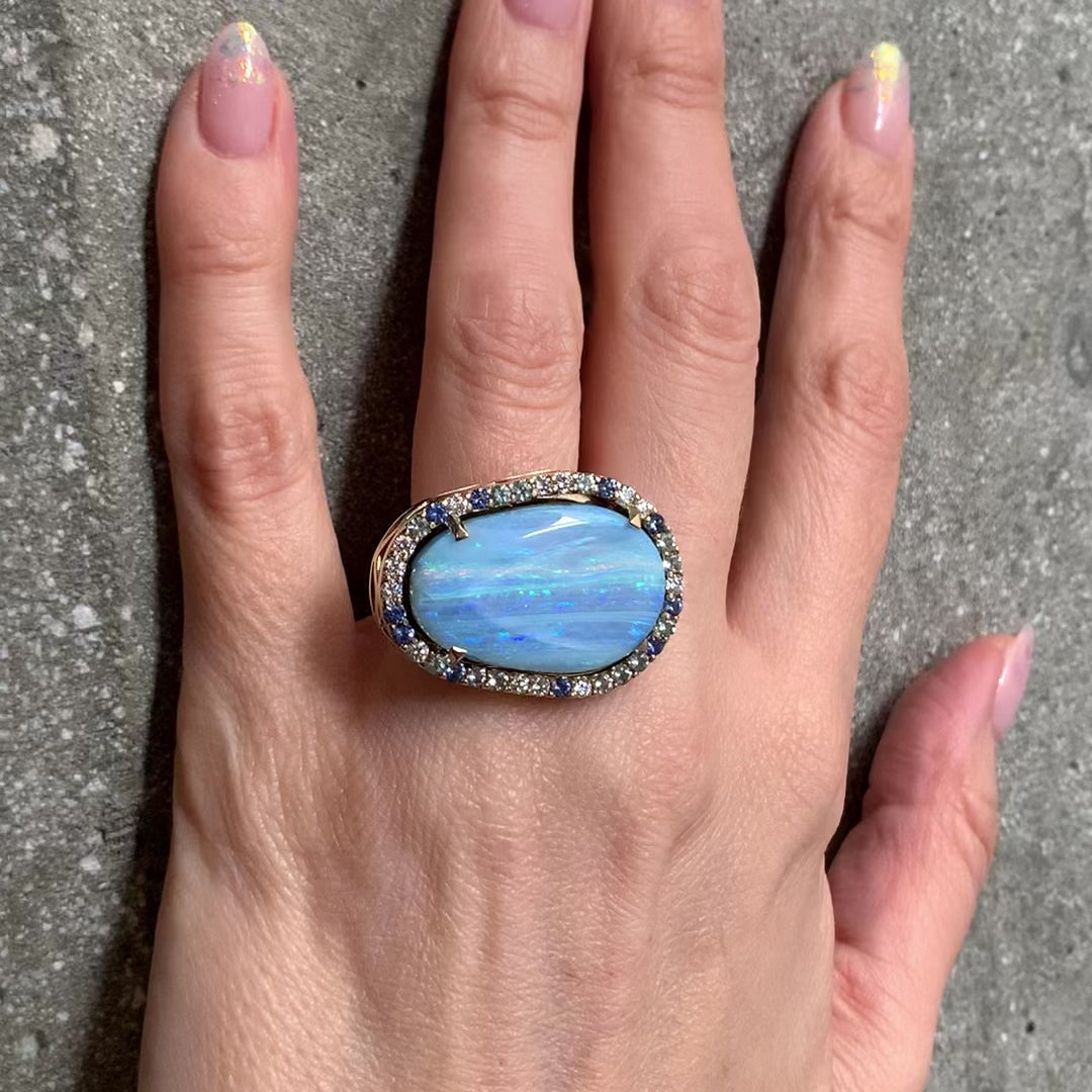 More than seven years in the making, the Polychroma collection has been painstakingly designed and curated, with each piece brought to life through a slow and considered process. Following two unforgettable road trips to the legendary opal mining town of Lightning Ridge (in 2018 and 2024) - both leaving a deep impression on Melanie - she was inspired to imbue these exquisite pieces with a spirit of exploration, connection, and reverence for the opals’ raw, natural beauty.