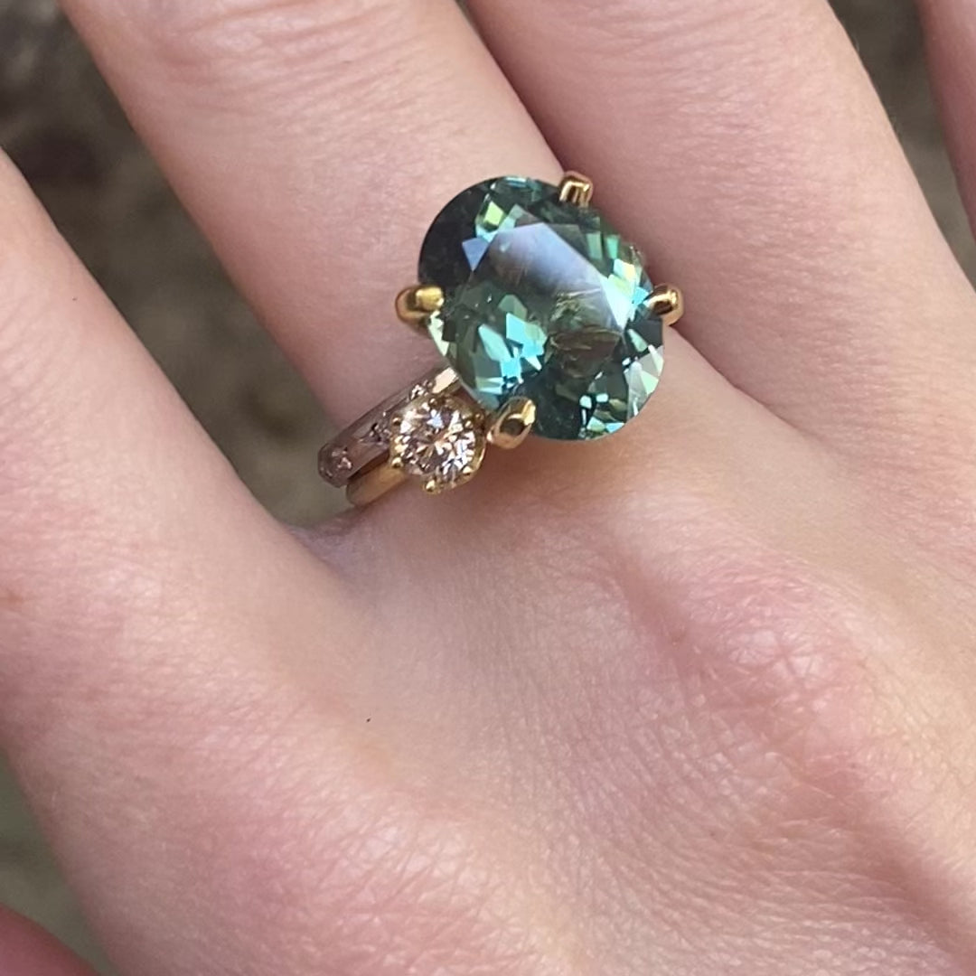 Teal, Green and Pink Sapphire Cluster with Champagne Diamonds RingTeal, Green and Pink Sapphire Cluster with Champagne Diamonds Ring