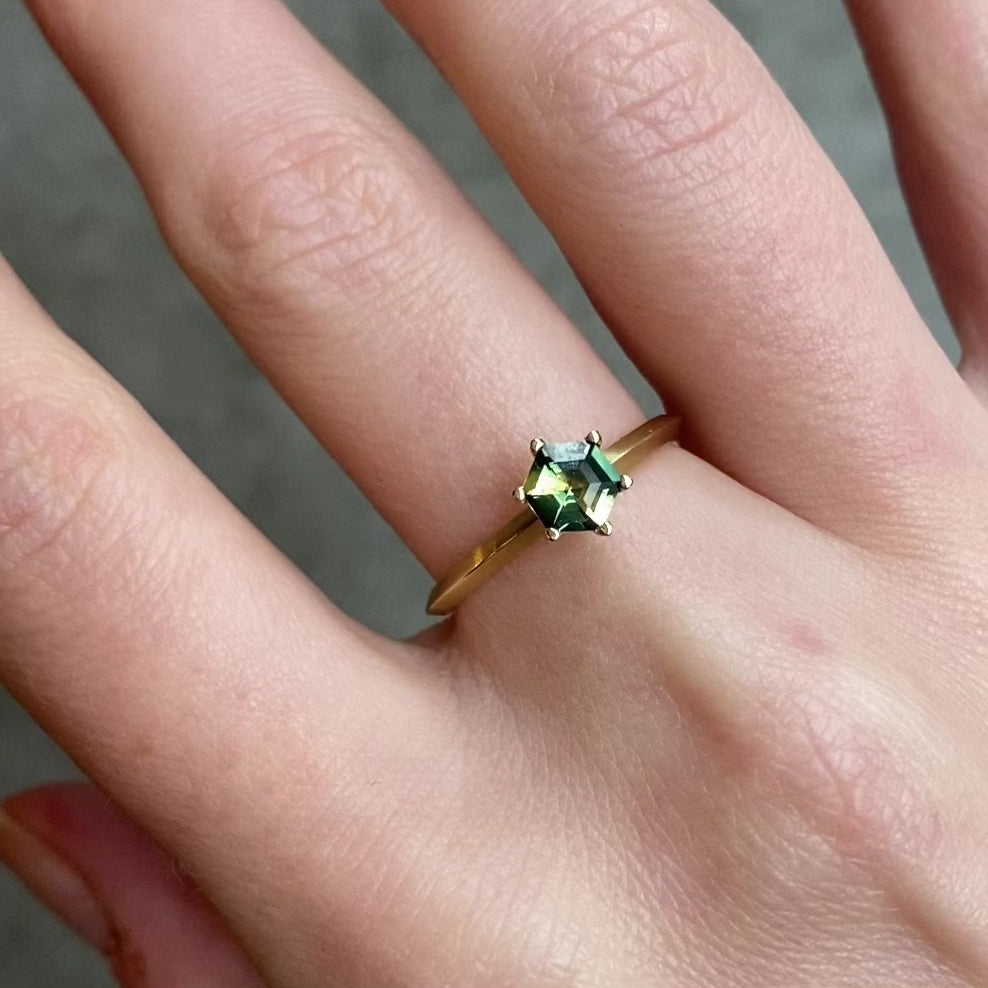 18ct yellow gold set with a 0.54ct hexagonal step cut Australian parti sapphire, matte finish