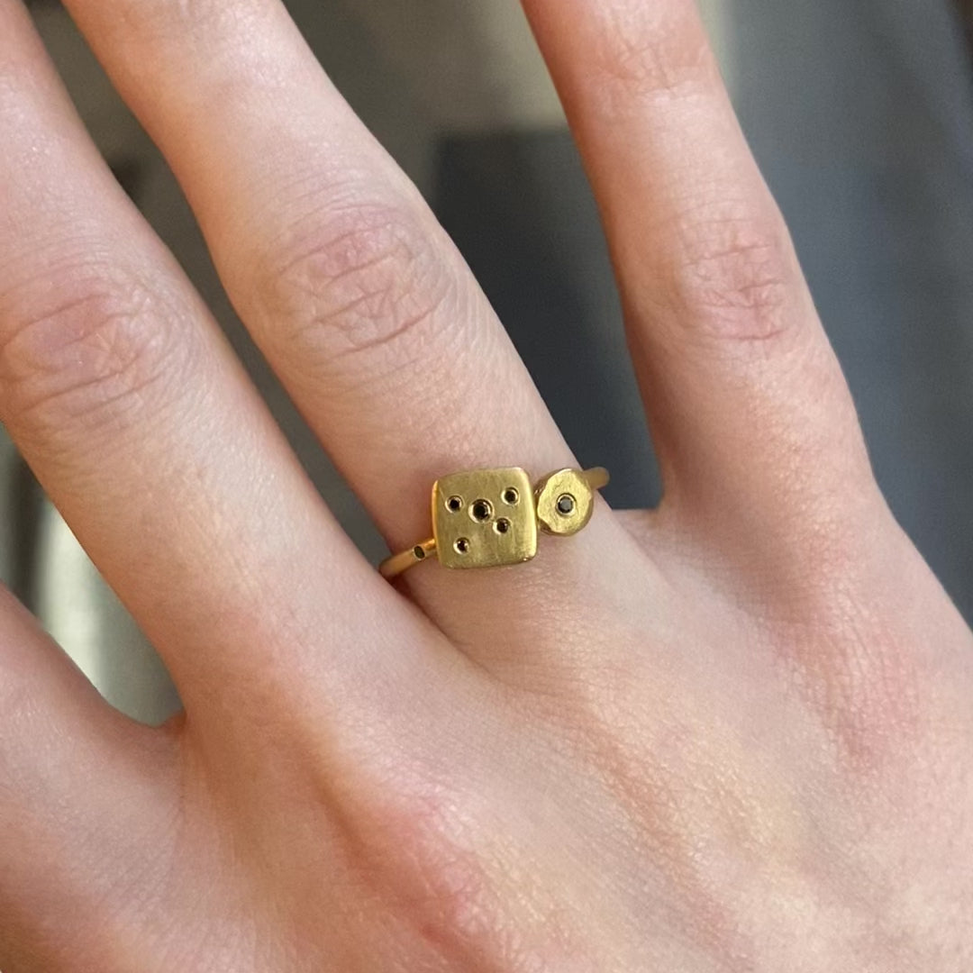 "Emerging from the Transformations series, this ring continues with the interplay of two forms bonded together, featuring a distinctive cluster of round black diamonds."