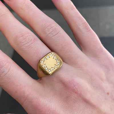 Pillowy boulder ring with bead set brilliant white diamonds. Matte textured finish with hollow rear at face. Ancient moments.
