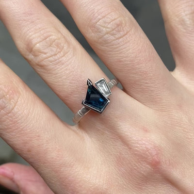 "I immediately fell in love with this unusual hand cut Australian sapphire when I discovered it in a private collection, where it had been held since it was purchased directly from a gem fossicker in the 1970s. I designed the open side panels of the setting to reveal the subtle layers of natural colour banding. The asymmetric arrangement reminds me of a fossicker's loose stones; the angle of the sapphire on the band a compass point, leading him home."