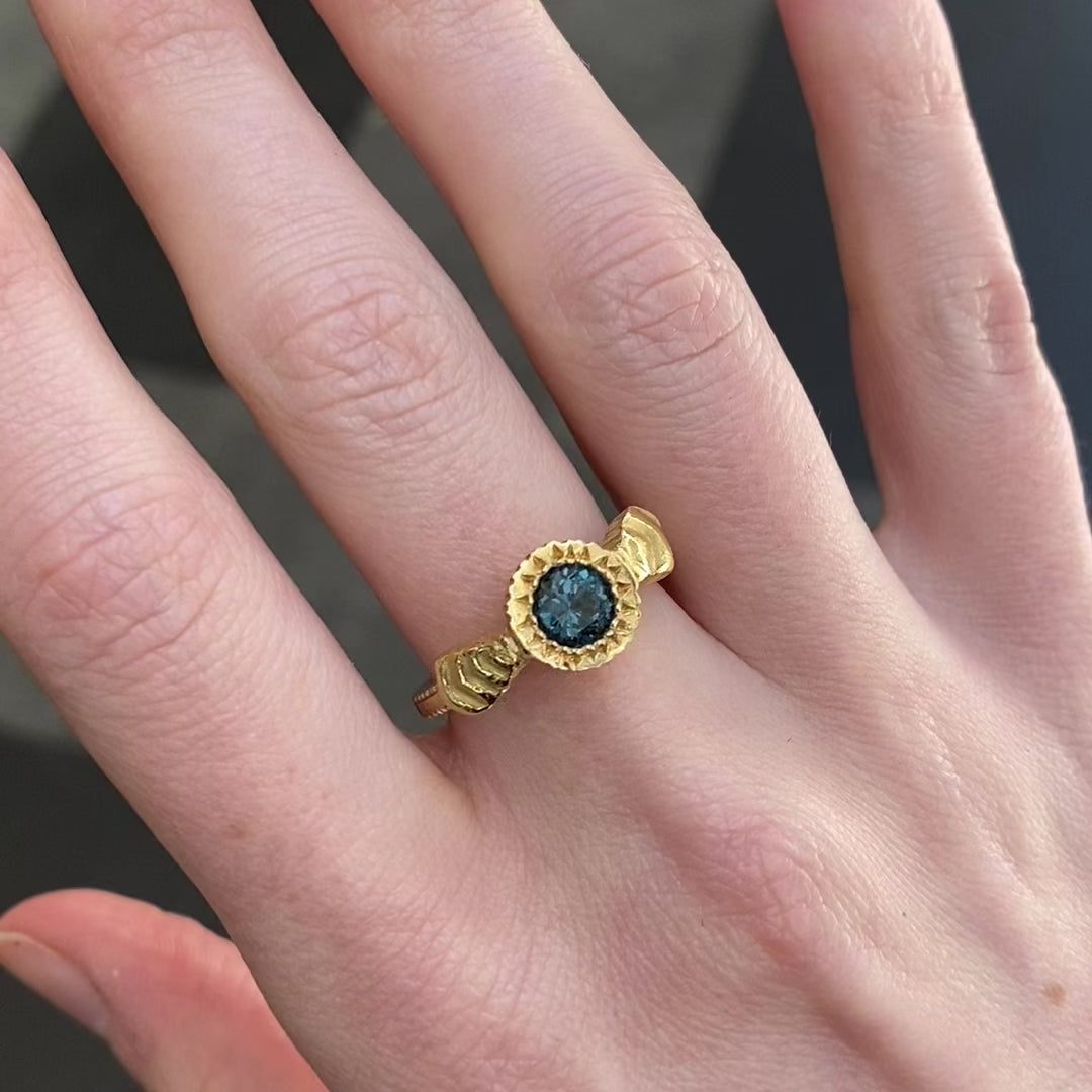 "I'm enjoying bringing colour into my collection. This sumptuous spinel called for regal yellow gold to house it, and an exploration of textural techniques that are new to my work."