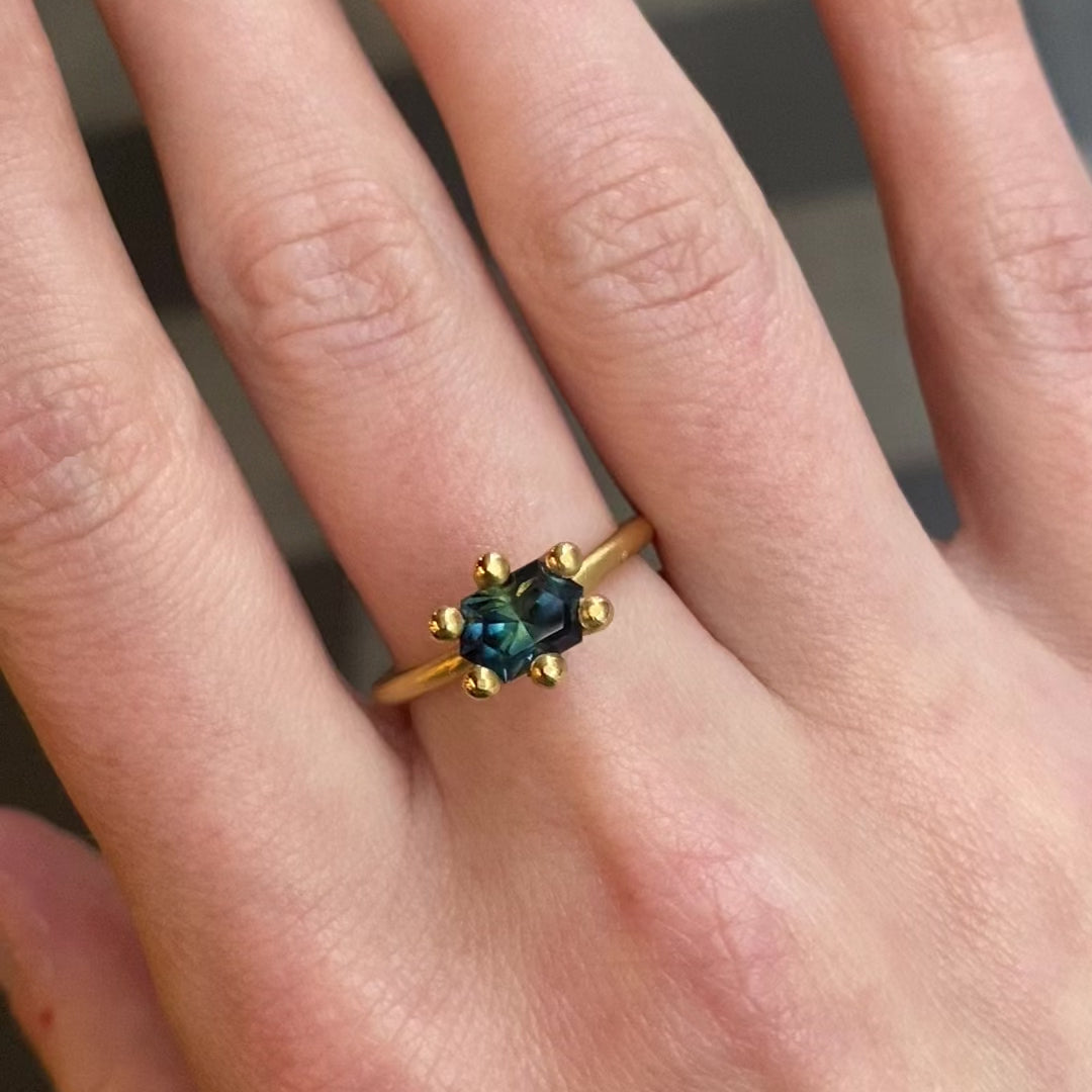 18ct yellow gold with a 1.35ct long hex cut Australian parti sapphire (with pharaoh's eye)