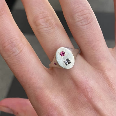 Sterling silver signet ring set with a 3.0mm princess cut grey spinel 0.14ct, a 2.5mm round pink spinel and 1.5mm round pink sapphire.