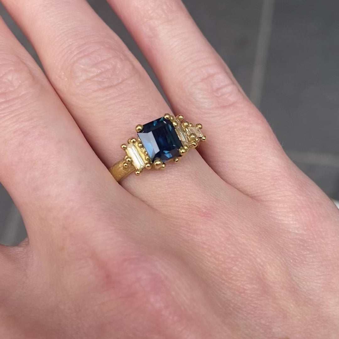 One of a kind sapphire and diamond asymmetric cluster ring featuring a unique deep blue emerald cut sapphire flanked by the linear forms of baguette cut white diamonds. A striking alternative engagement ring, inspired by the myriad of treasures discovered throughout the prosperity of history, now re-imagined into a wearable, contemporary artwork. Handcrafted with careful attention to every small detail in our London atelier.