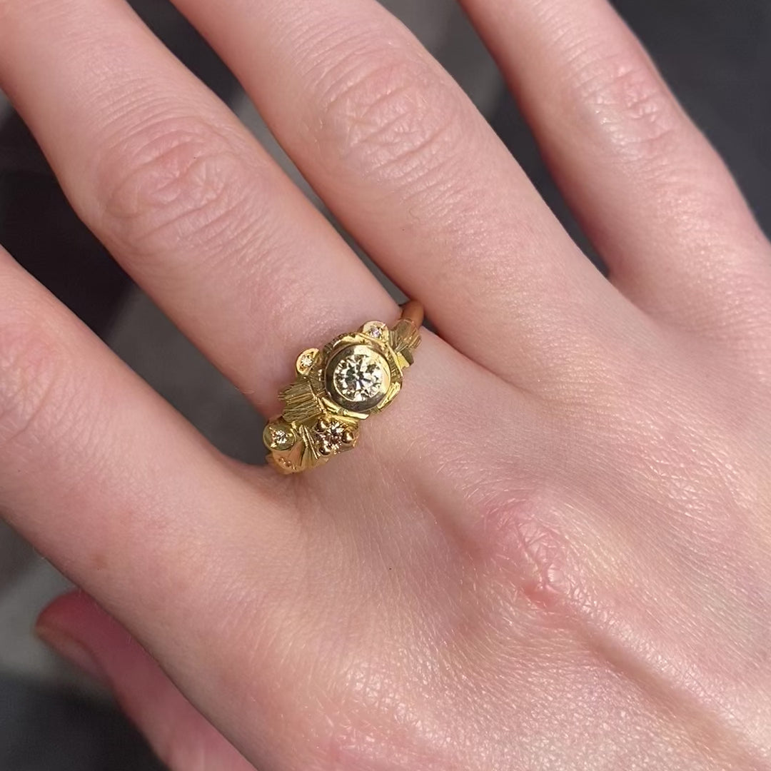 A beautiful Australian champagne diamond from the Argyle mine is embedded into a sculptural, organic landscape. Accented by white diamonds, the ring sits close and low to the finger and is an understated piece filled with opulent details and textures.