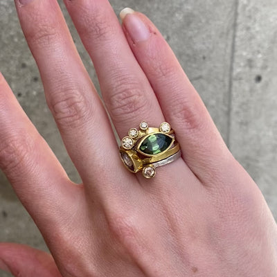 A beautiful warm champagne diamond, set in 18ct gold and white gold, the stack of four is completed with a scattered diamond wedding band, and a marquis cut sapphire band, solitaire champagne diamond and marquise pink sapphire band.