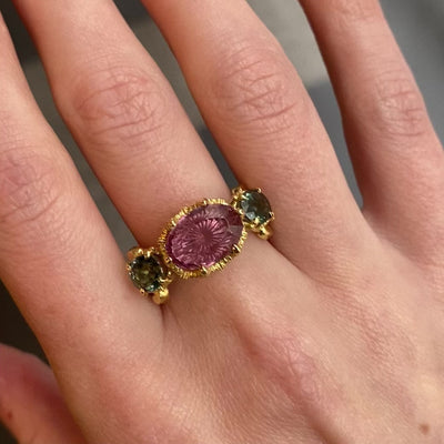 Named after Saint Genevieve, patron saint of Paris, due to the starburst facets in the central garnet reflecting the joie de vivre of the city of lights. The stone is a highly unusual pale pinky mauve colour change lotus garnet that has been enhanced using cutting edge faceting tools, currently pioneered by lapidarists in the US. Colour change garnets are treasured for their ability to alter colour in different light. Colour change garnets historically symbolise transformation and adaptability. Intricately handcrafted in 18ct yellow gold and featuring a signature William Llewellyn Griffiths split shank and Neo-Classical garland setting decorated with fine floral details. Flanking the central stone are two teal sapphires which compliment the central garnet elegantly.