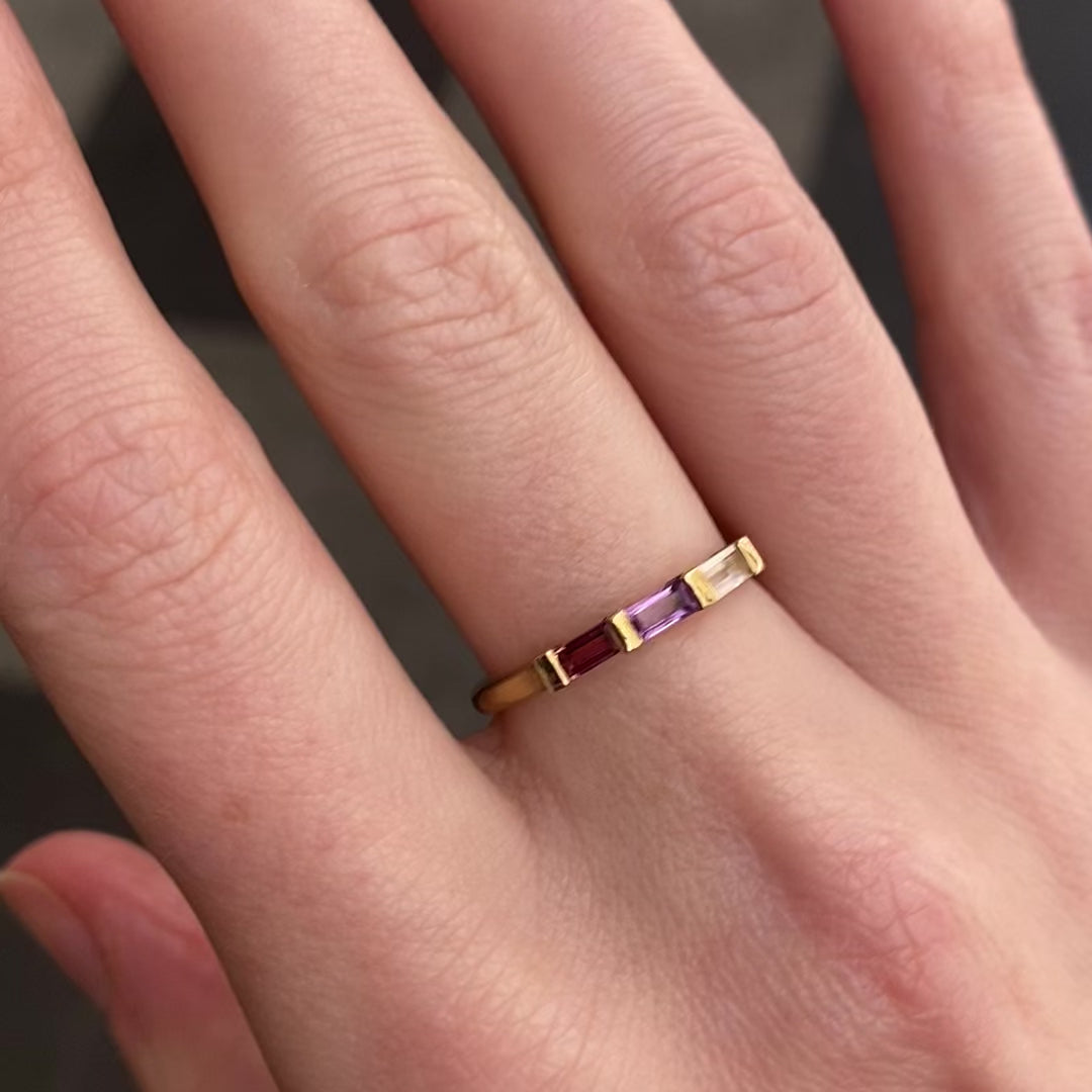 9ct yellow gold set with 4x2mm baguette cut pink tourmaline, amethyst and rose quartz, matte finish