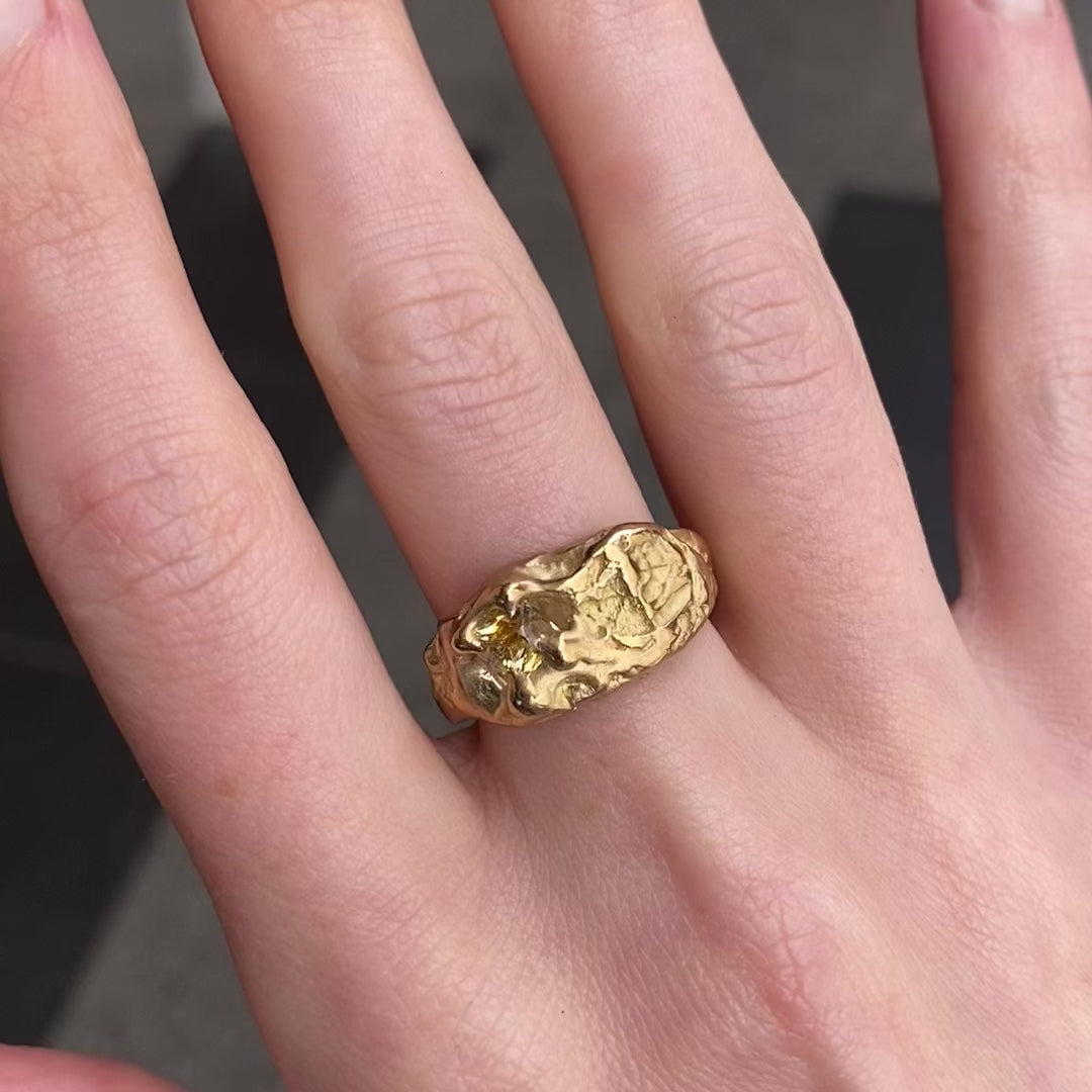 "This signet style ring is my take on the classic unisex signet ring, incorporating my signature stone texture with a vibrant yellow sapphire "