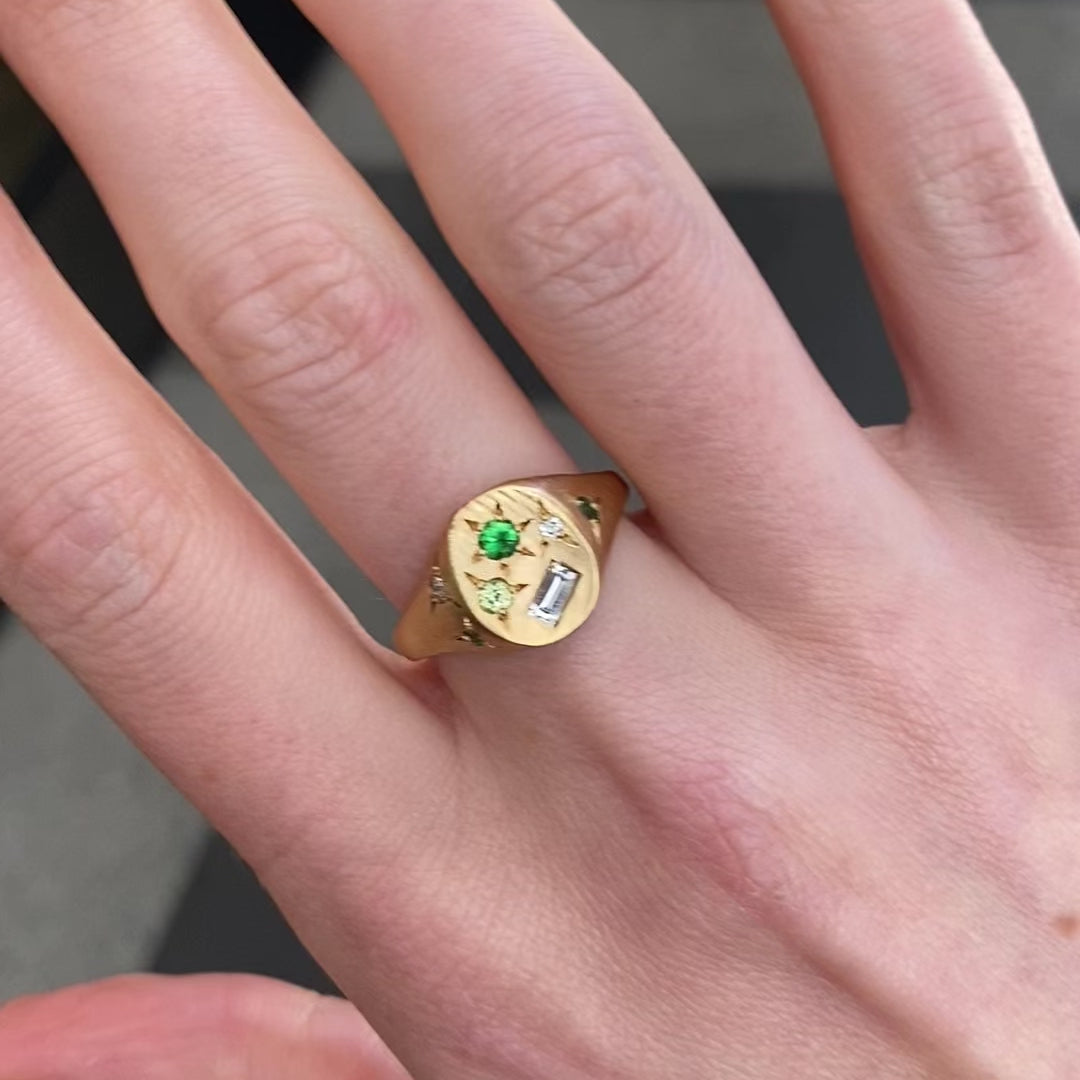 9ct yellow gold signet ring with rounded band set with green stones and diamonds laid out in classic Seb Brown style.