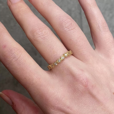 Each of the twenty white diamonds in this eternity band are surrounded by ultra-fine beaded surfaces that catch and reflect the light. By working at a microscopic scale to create these surfaces, I explore how a sense of wonder can be created by observing details just beyond the normal range of perception.