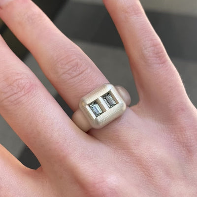 A pair of baguette sapphires are captured in Georgie Harrison's signature Bonded setting, the technique itself forming a material bond that symbolises lasting connection. A ‘Toi et Moi’ ring in keeping with the exaggerated volume and sentiment of the Bonded collection.