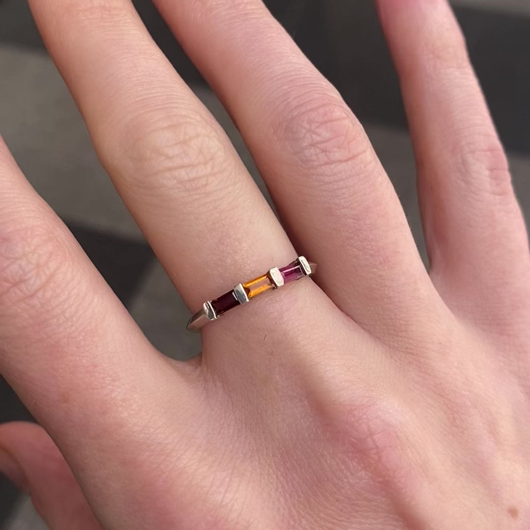 A contemporary juicy band with three baguette cut semi precious stones sit in formation atop my signature knife edge band in sterling silver. This architectural beauty is a great stand alone piece.