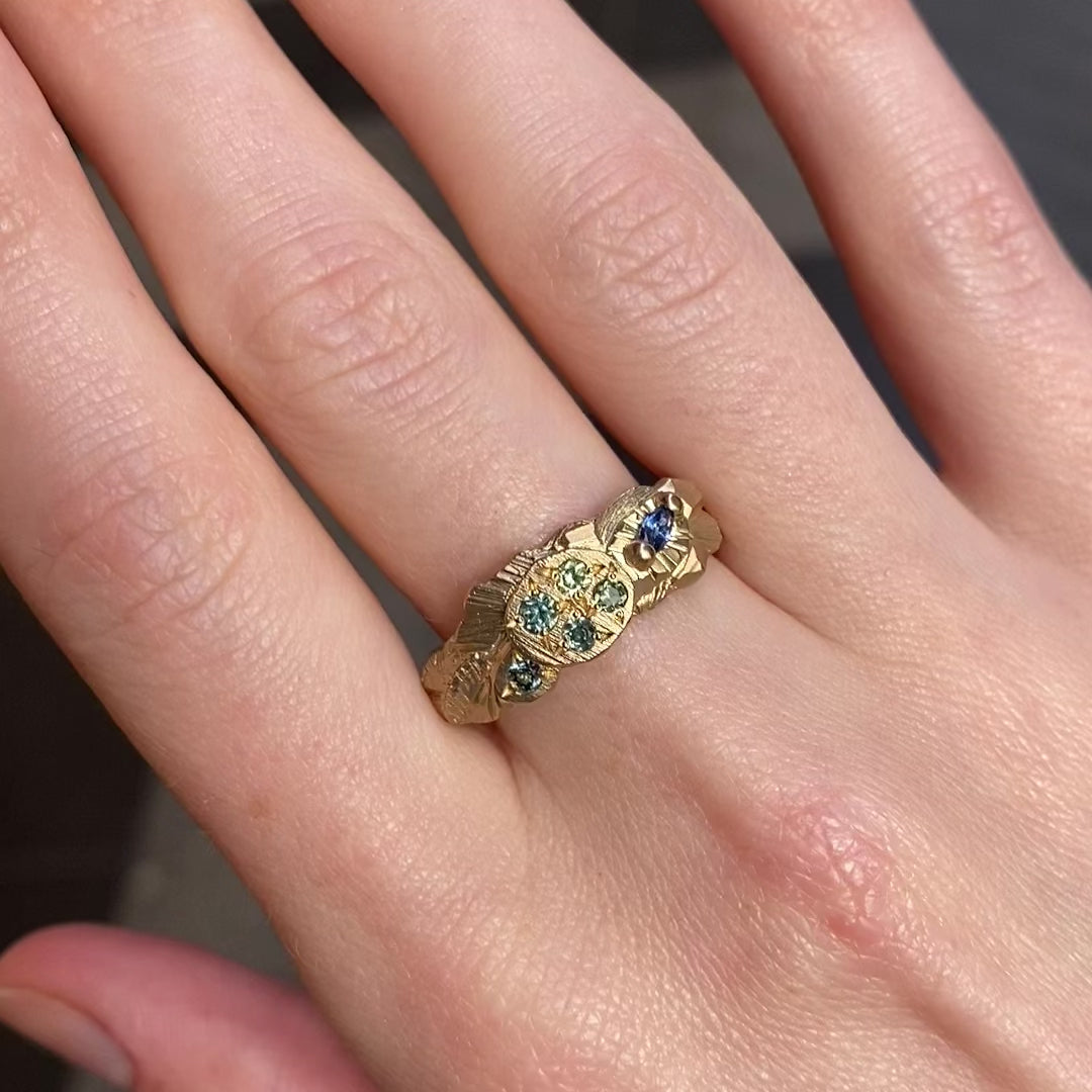 9ct recycled yellow gold with 4x2mm blue Ceylon sapphire, 2mm Australian blue sapphire and 4 x Australian blue green mixed sapphires