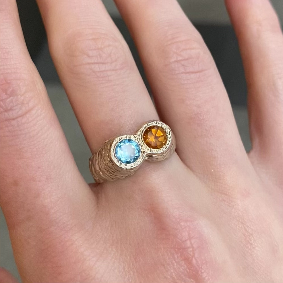 "A manual play on 3D printing, this ring is delicately hand built layer by layer into its final form. This slightly offbeat design showcases a large mid-blue topaz and citrine in a textural setting."