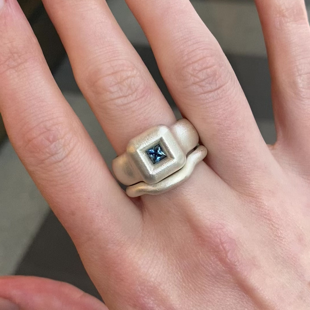 "A square setting puffs up around a princess cut Australian sapphire in a juxtaposition of angles and curves, the blue gem sunken below the surface like a hidden oasis. Crafted in fine silver with a wide, soft band, the exaggerated form is a weighty and spirited statement.