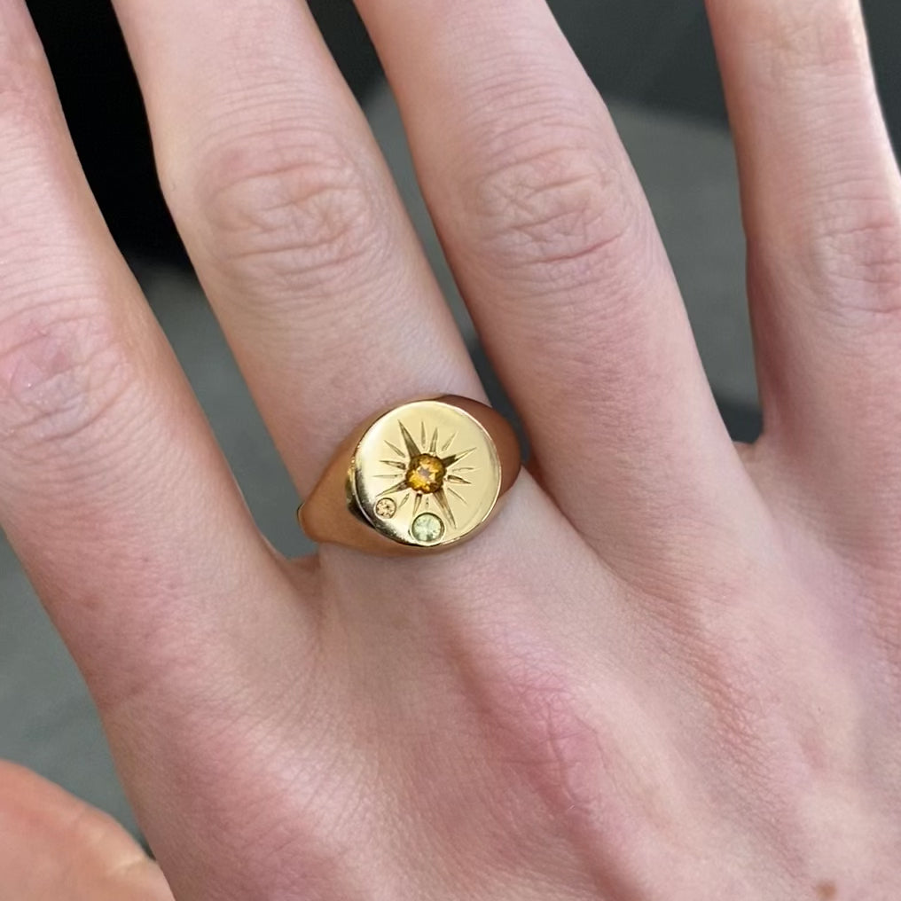 9ct yellow gold signet with 3.0mm citrine, 2.0mm & 1.25mm sapphires