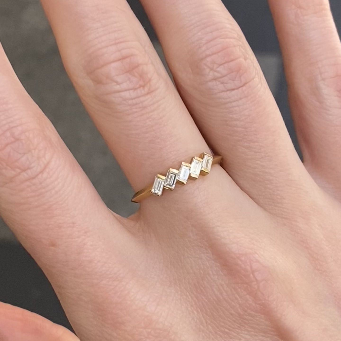 The Staggered Baguette Diamond engagement ring features five sparkling white baguette cut diamonds set in a staggered formation atop my signature knife edge band.