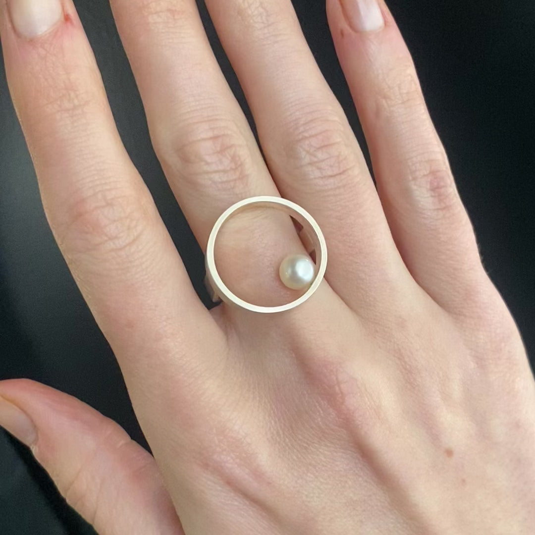My work plays heavily on the pure forms of geometry - like the circle. As well as the lustre pearl, the negative space created by this ring creates a truly interesting form on the wearers hand.