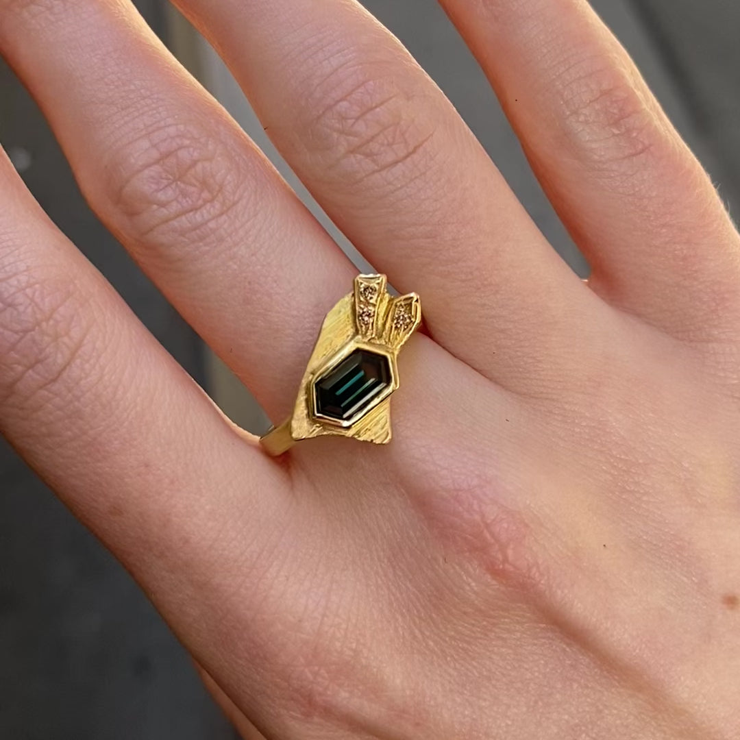 "'Near & Far' is titled for the journey these materials have been on, beginning with their genesis deep within the layers of Australia's earth. A sapphire plucked from Tomahawk Creek, Queensland, then cut by hand in Adelaide, South Australia, joins forces with three glistening champagne diamonds from the Argyle mine in Western Australia, encased in recycled Australian gold. They all came together on my bench in Melbourne, and who knows where their next journey will take them - a wearable showcase of Australia's finest materials."