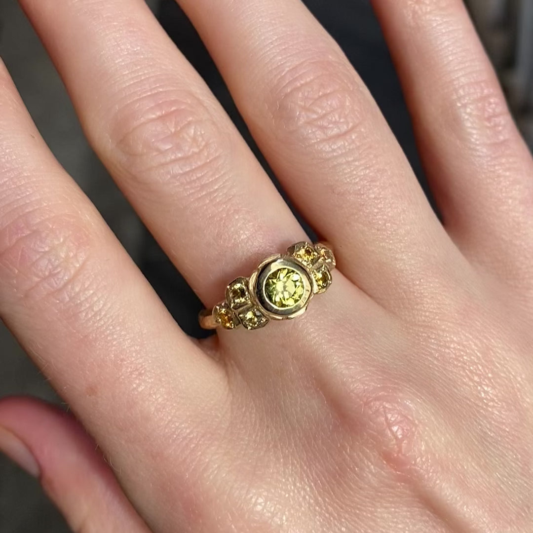 A ring built around a beautiful, Australian, green parti sapphire that was mined and cut locally. The central stone perches above rock formations embedded with tonal Montana sapphires. These are colours I see when walking along the Merri Creek as the season changes.