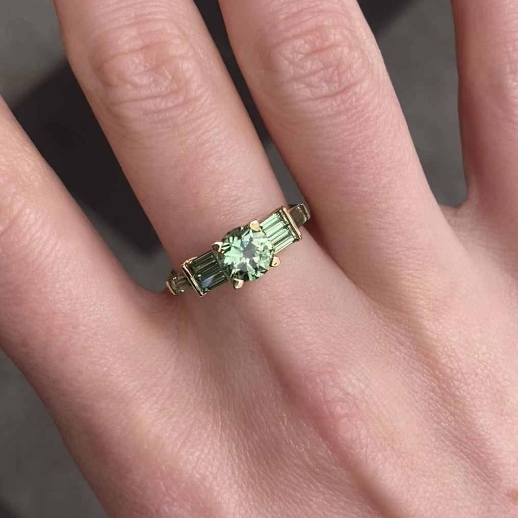 This ring is designed to hero a beautifully cut Australian parti sapphire which is harmoniously balanced with 6 staggered baguette Australian parti sapphires, inspiring the ring title. It's reminiscent of Art Deco designs but stands alone as a contemporary piece, it's what I like to call a Future Classic.