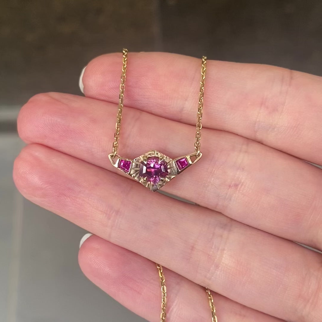 9ct yellow gold with 0.96ct freeform hexagon garnet 6.2 x 5.7mm and 2 x square tapered rubies 2.4 x 2.0mm on 9ct yellow gold chain