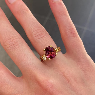 A deep pink claw-set tourmaline, with scattered diamond in the band is set off with a sparkling champagne diamond in 18ct yellow gold to complete the stack. This design is more in keeping with my simple signature stacks.