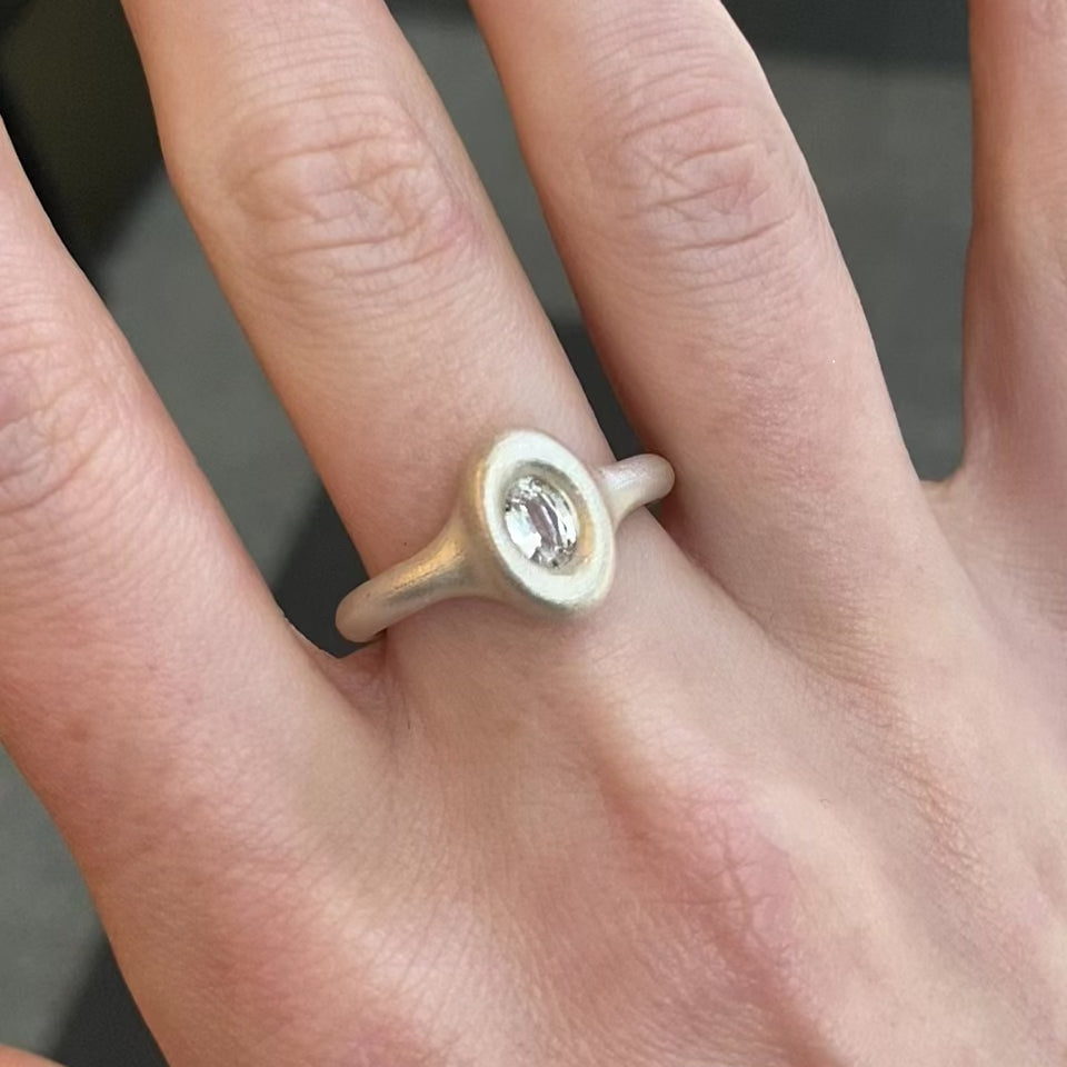 "The Polar ring features an oval white sapphire plunged deep into a north-south setting, ensconced by a swell of fine silver. A quietly modern style intended as an engagement ring.