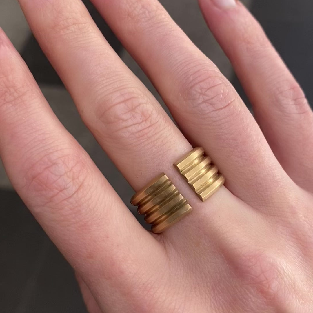 "A bold, wide gold ring with a minimalist design, featuring repetitive detailing and a clean vertical cut out. Wear the opening at the front or at the back for a more subtle look."