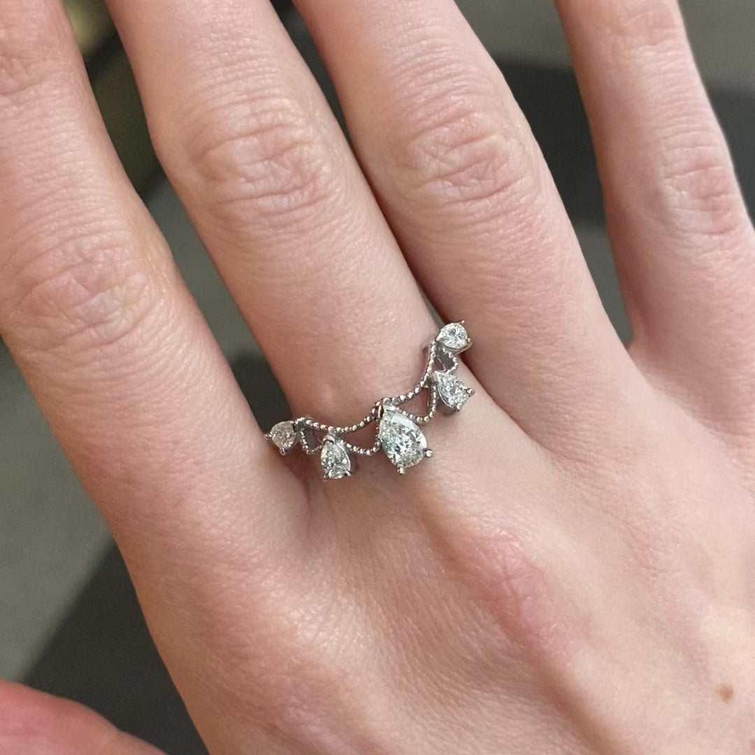 "This ring features five pear cut white diamonds, seemingly dripping from an 18ct white gold band. The diamonds become smaller as they move from the centre, giving the ring a lovely balance. Crafted as part of a set, this stunning ring beautifully compliments any of my engagement rings."