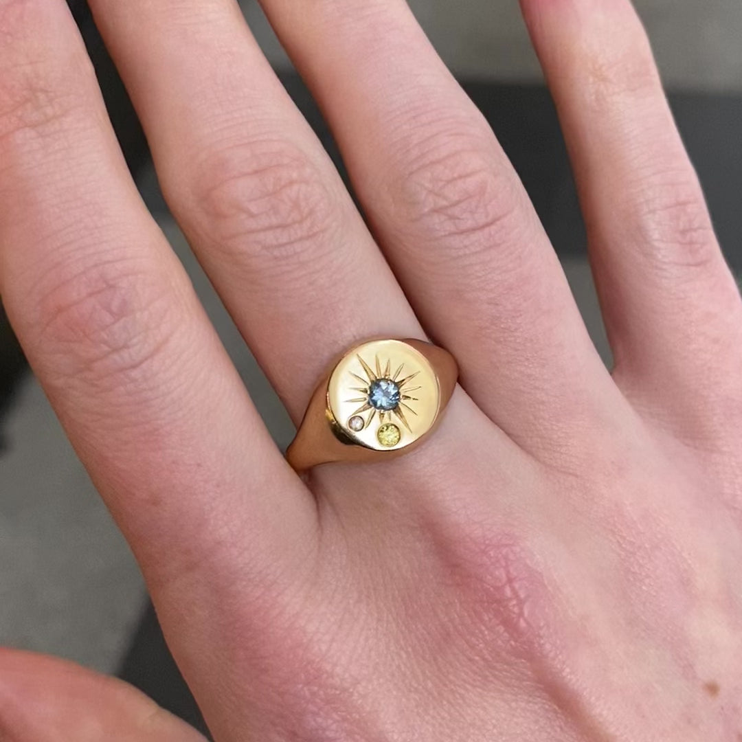 9ct yellow gold signet with 3.25mm aquamarine, 2.0mm & 1.25mm sapphires