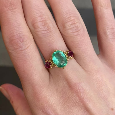 The Sultan's Ring features a resplendent 2.8 carat emerald, contrasted by two luscious pear-shaped rubies. Intricate garlands surrounding the stones, are embellished at intervals with six white diamonds.