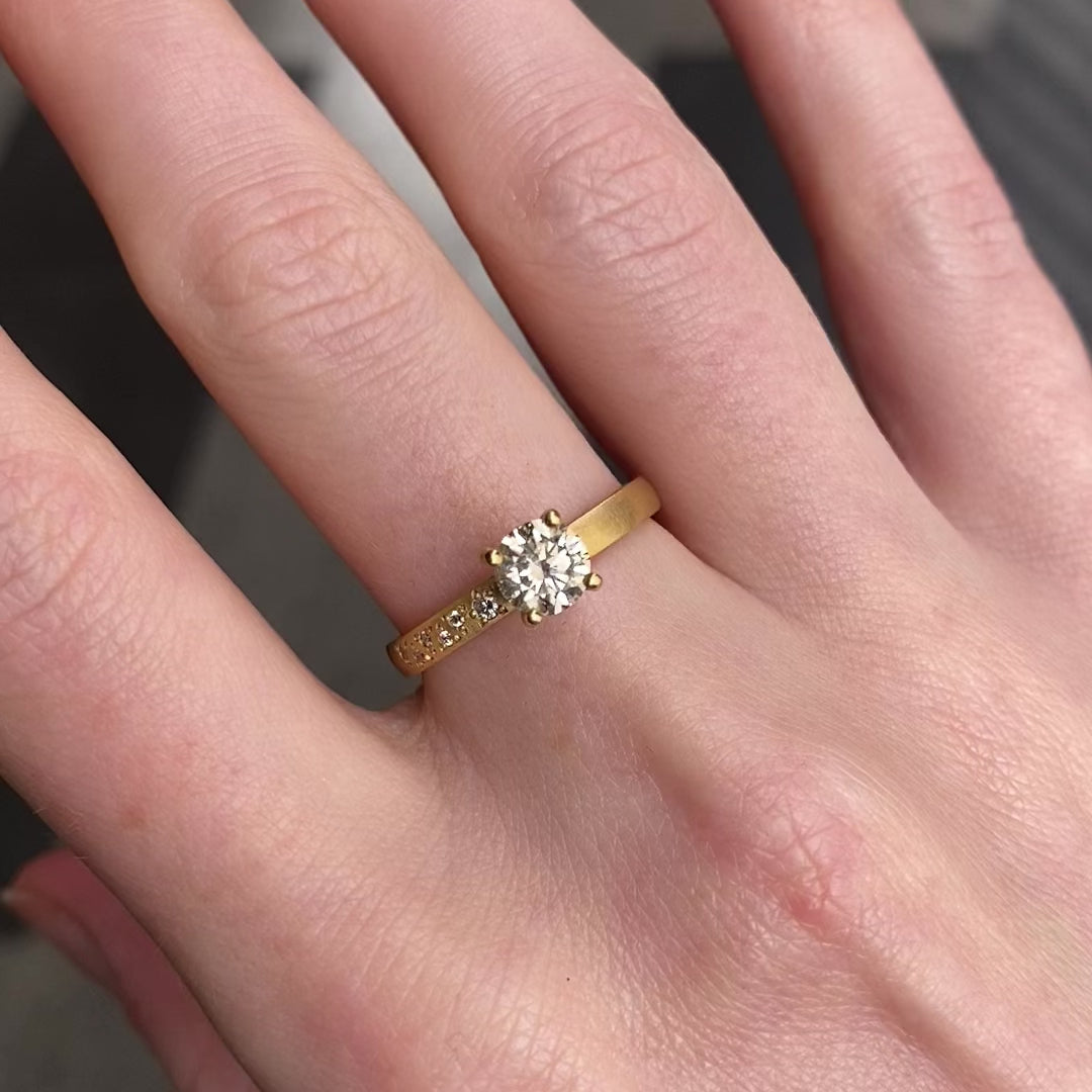 "A classic, refined design with the focus on the centre stone and a scattering of diamonds to one side. The centre champagne diamond gives warmth and is complimented by the yellow gold."
