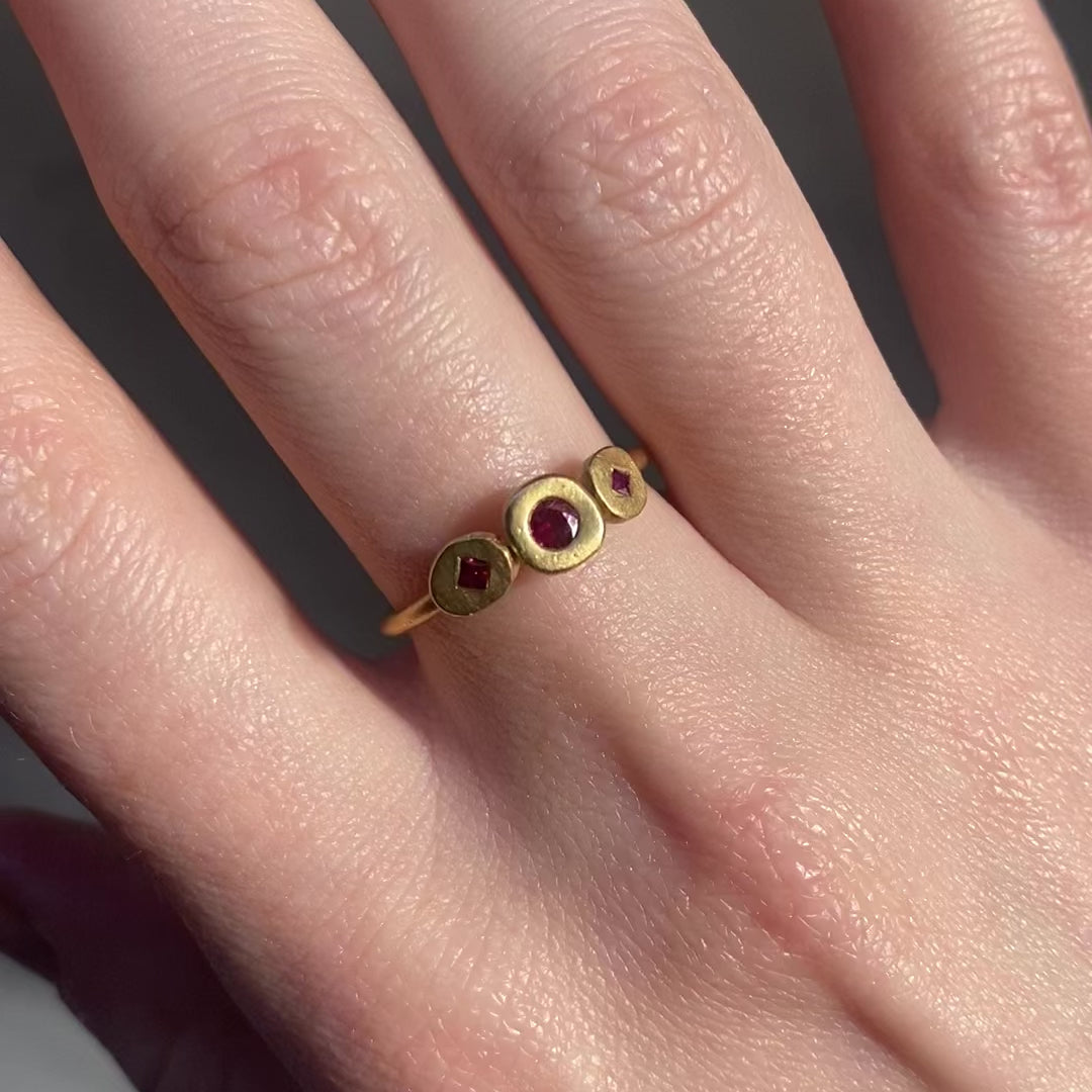 "This ring is made from 18ct yellow gold featuring round brilliant cut and princess cut rubies, inspired by hidden treasures and hints at travels across time and space."