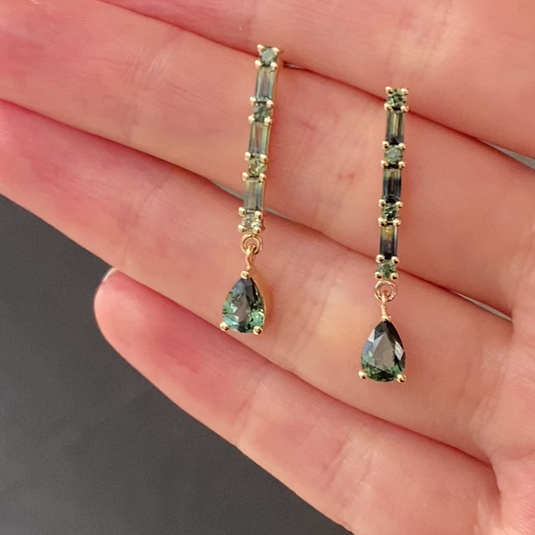 These one of a kind earrings were designed around these striking pear cut Australian parti sapphires. Using sapphires from Rubyvale in Queensland, this pair of earrings is designed to be a unique modern heirloom and my intention is they are worn with joy, daily, by their new owner.